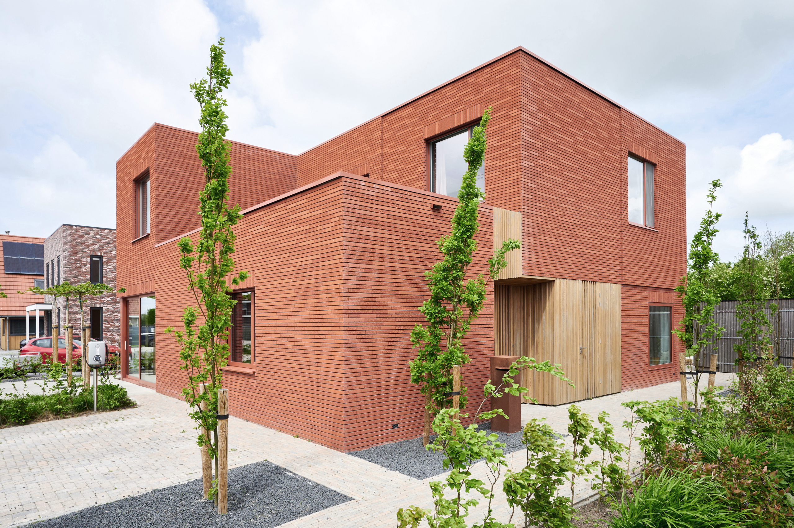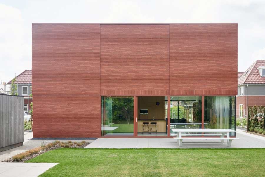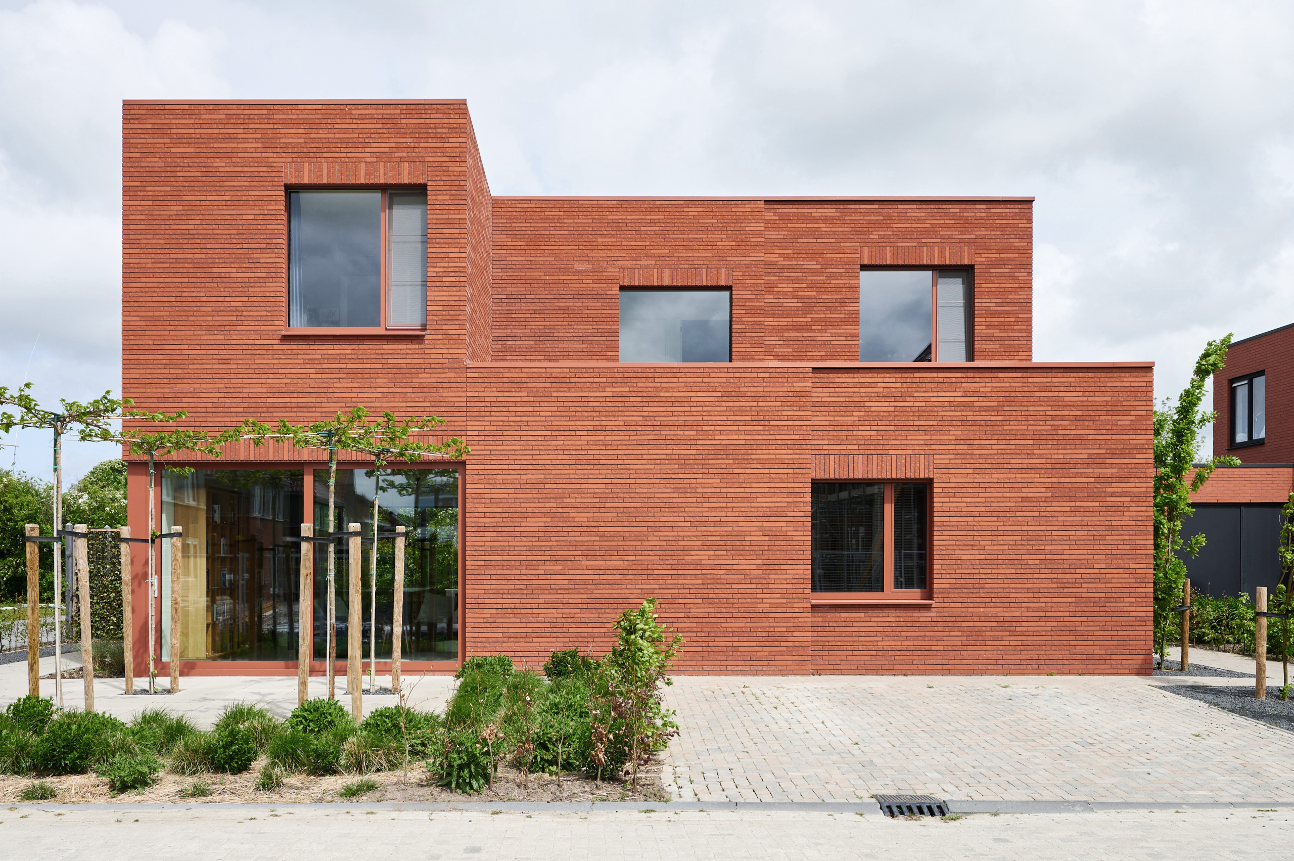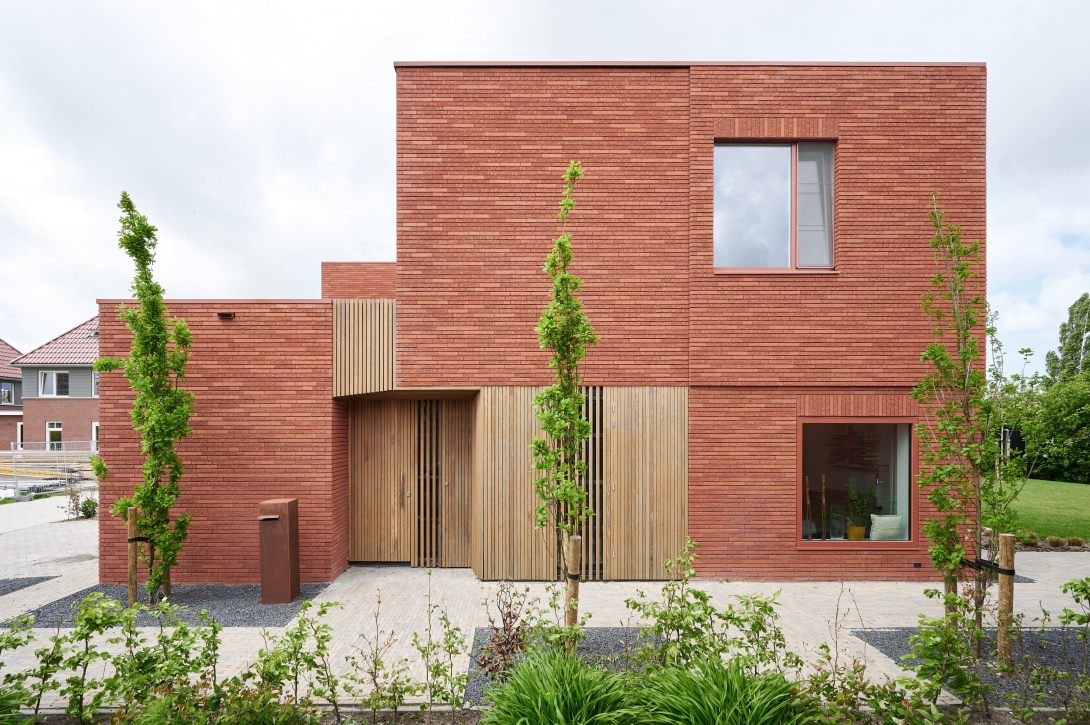 The red brickwork gives the house a sense of weight and solidity from a distance. This firmly grounds the residence in the neighborhood. The subdivision of the facades (according to the golden ratio) creates a simultaneous sense of modernity and monumentality. The details in the brickwork at the edges and facade openings add refinement and grace to the facade.