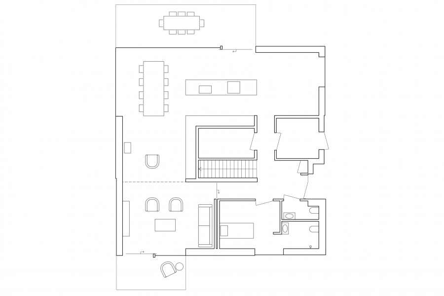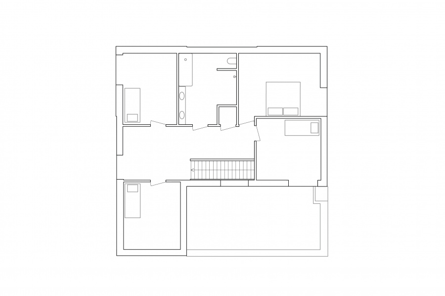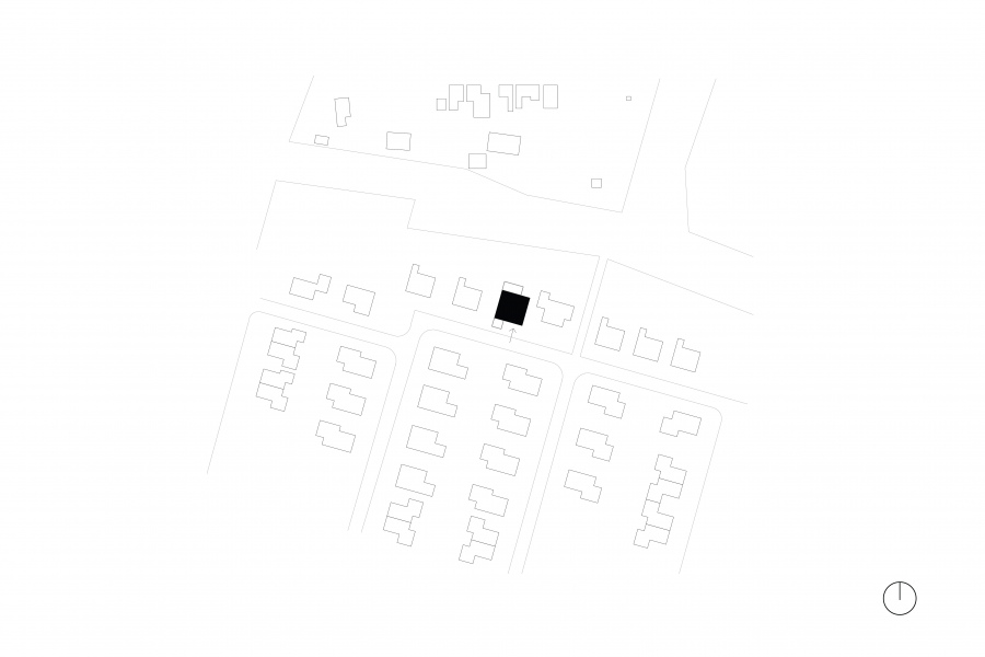The ground floor living space is a single area with three enclosed rooms, allowing the family to be together while still having the freedom to engage in individual activities. The positioning of the rooms and openings in the facade creates distinct and diverse spaces. On the upper floor, the bedrooms are organized around a spacious landing, serving as a second living area for play and work.