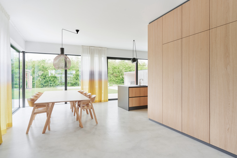 The house is compact, well-insulated, equipped with solar panels and a heat pump. As a result, the house generates more energy than it consumes.