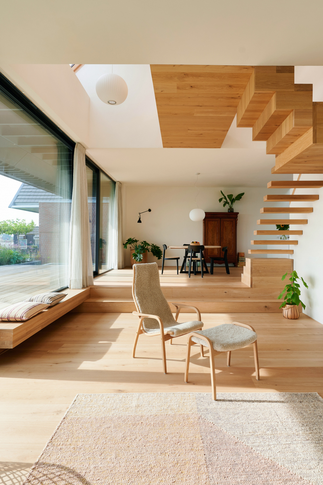 Privacy en transparantie gaan hand in hand omdat openingen in de gevel met precisie zijn bedacht en geplaatst. Veel glas op zuid zodat het het landschap panoramisch ervaren wordt. Een overstek op de zuidkant zorgt voor schaduw in de zomer en een droge verblijfsplek op het terras. In de noordgevel zijn subtiele ramen gemaakt die zicht naar de straat bieden maar weinig zicht naar binnen. Een uitdrukkelijke wens van de opdrachtgevers.
