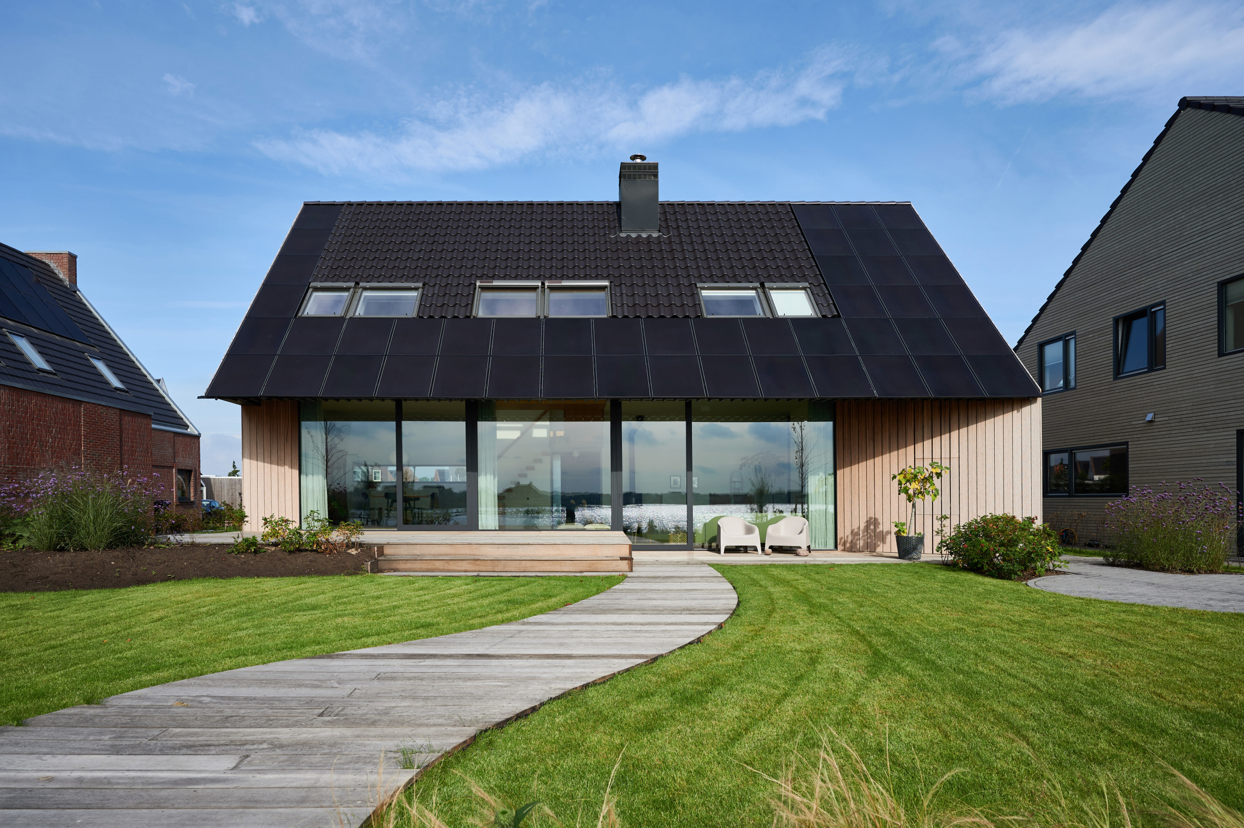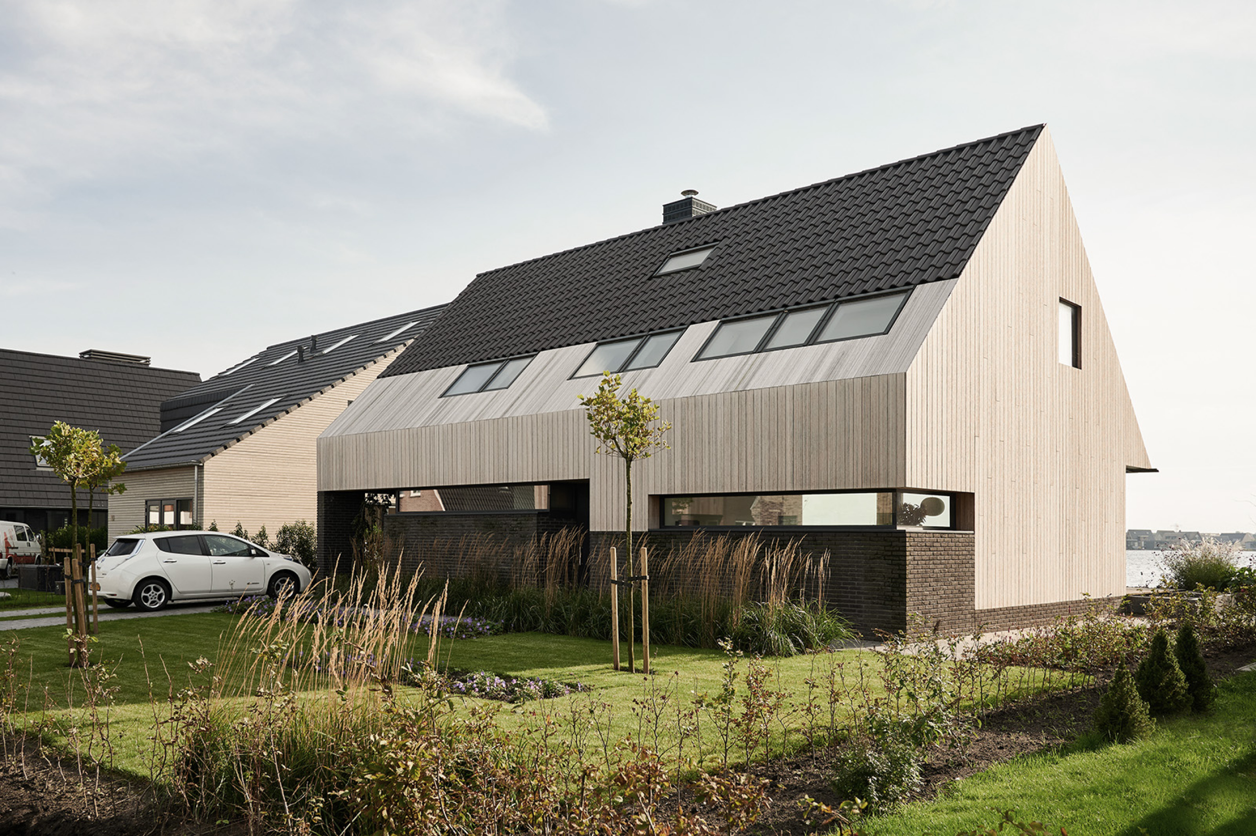Het huis is duidelijk gericht op het water en daarmee op de zon. Maximalisatie van woongenot en energieopbrengst zijn van meet af aan leidend geweest voor het ontwerp en waren de motivatie om het huis dwars op de kavel te zetten. De kap heeft een groot dakvlak op het zuiden voor zonnepanelen en de achtergevel heeft een maximaal transparant raakvlak met de tuin en met het meer.